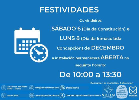 Os vindeiros sábado 6 e luns 8 de decembro a instalación permanecerá aberta no seguinte horario: 10:00 a 13:30
